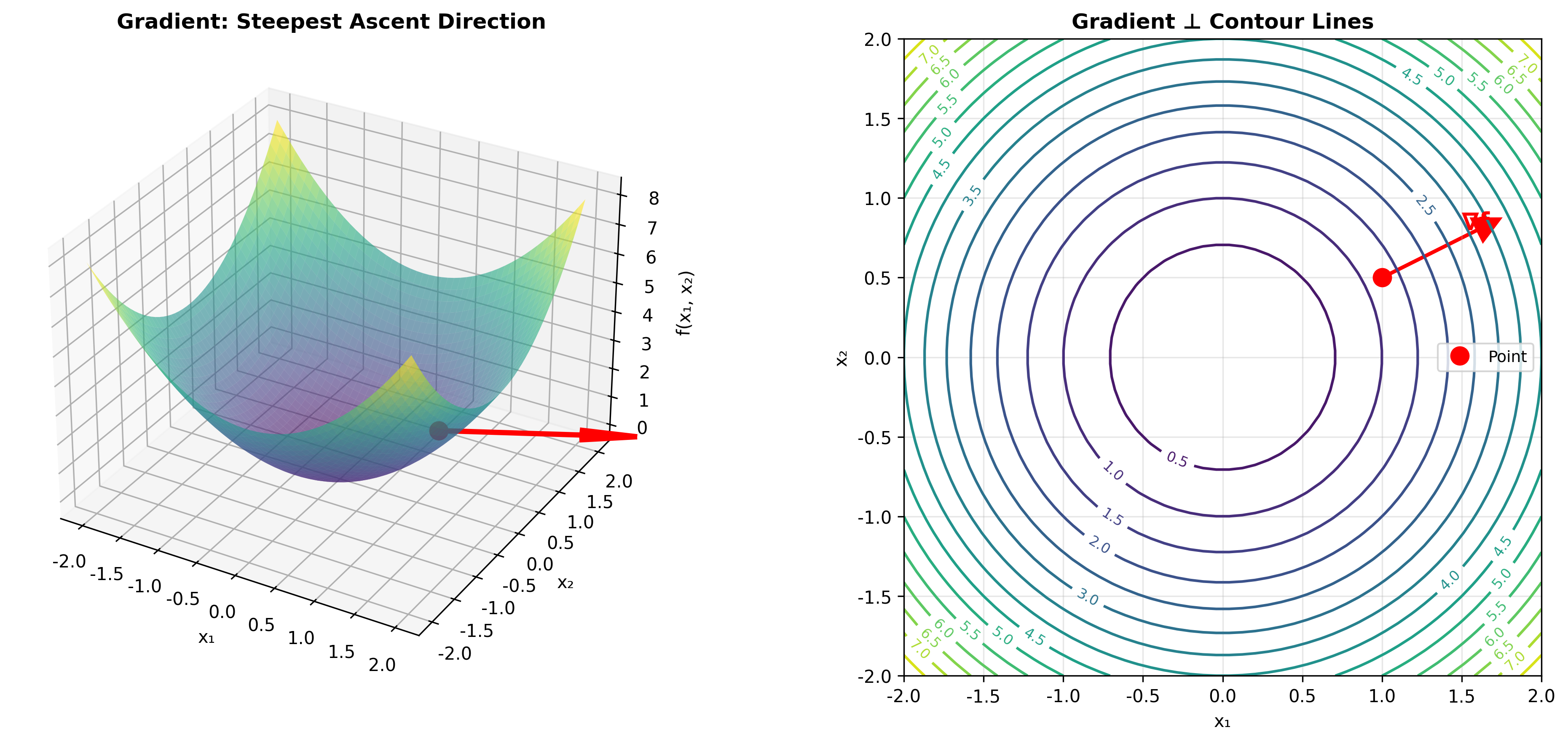 正交性:梯度与函数的等高线(等值面)垂直。这就像地图上的等高线——如果你沿着等高线走,高度不变;而梯度方向则垂直于等高线,是"上坡"最陡的方向。