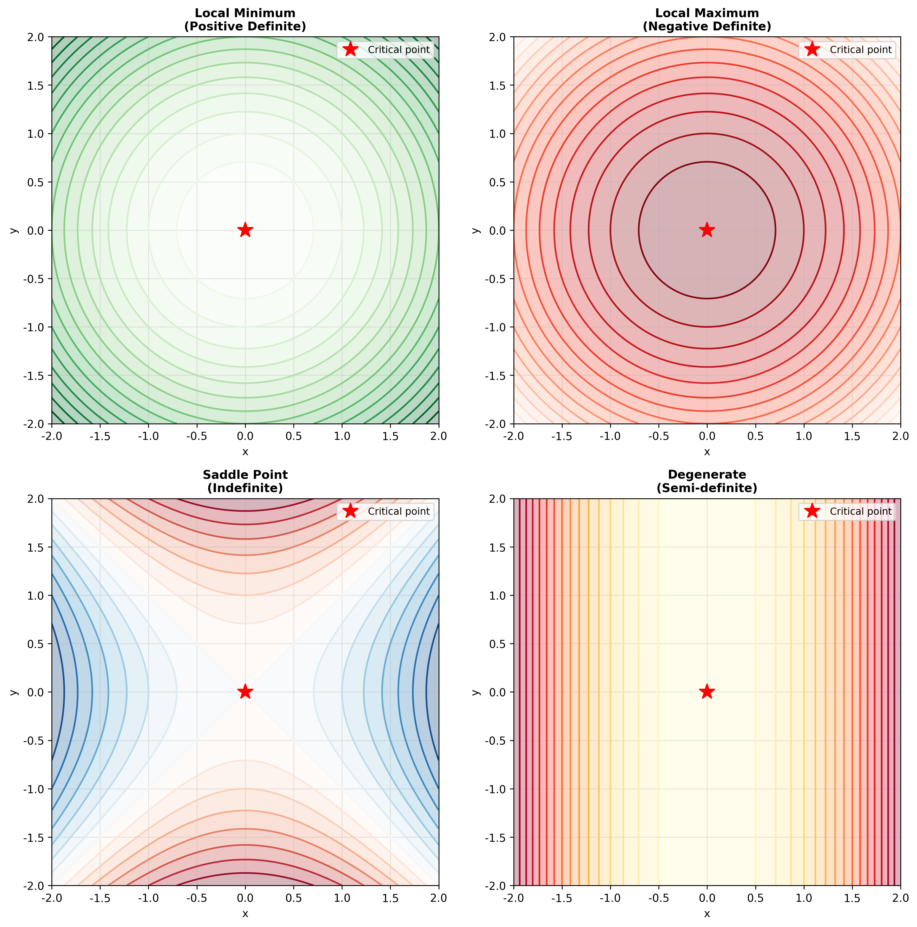 | 半正定/半负定 | 需要更高阶分析 | 某些方向是"平的" |