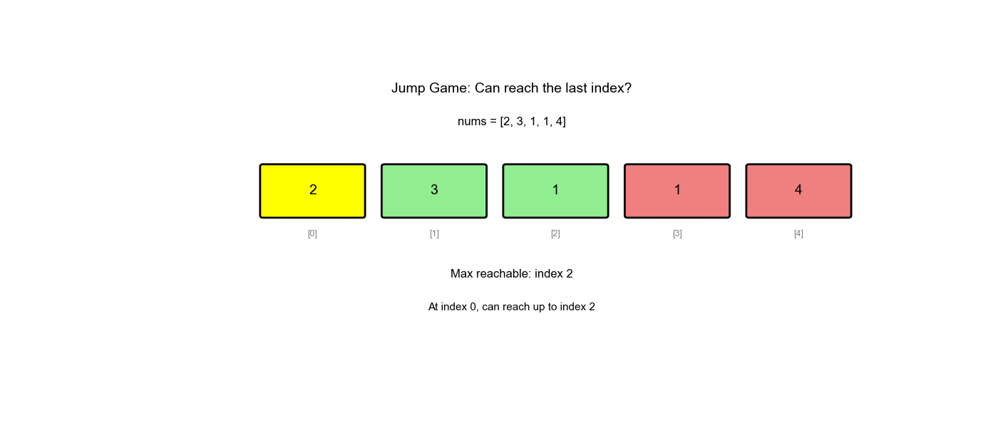 i是当前位置nums[i]是从当前位置能跳的最大距离i + nums[i]是从当前位置能到达的最远位置max(max_reach, i + nums[i])确保max_reach始终是"到目前为止能到达的最远位置"