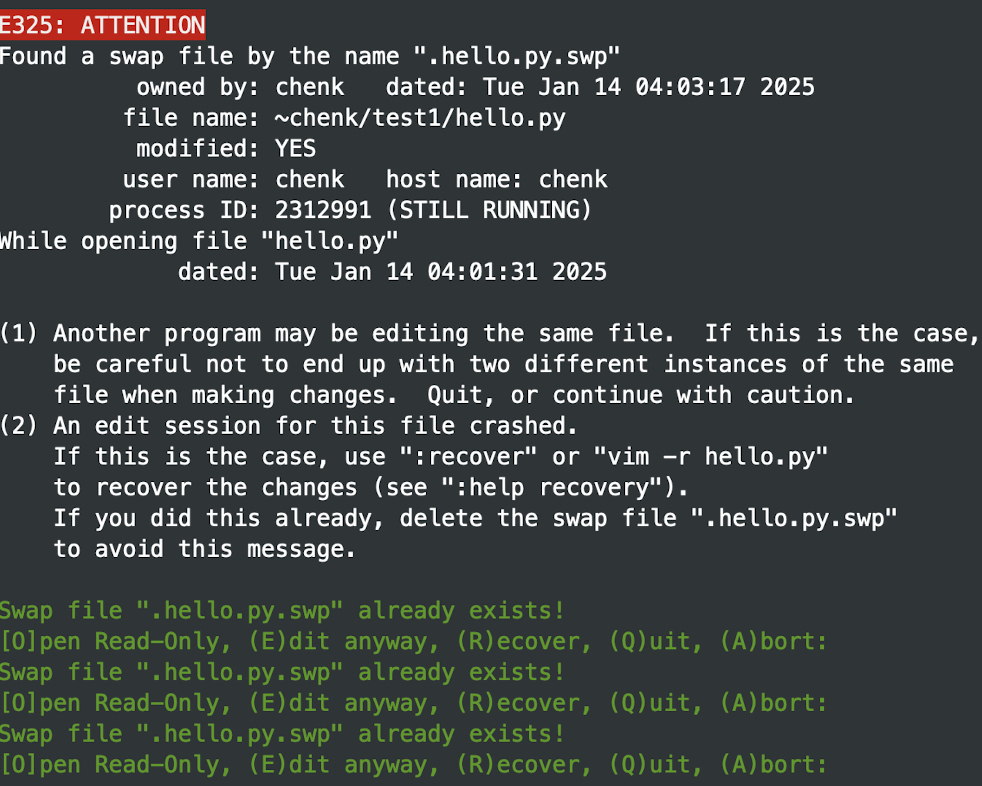 swp文件,vim该文件会提示可以进行的操作:继续、不管、退出等。