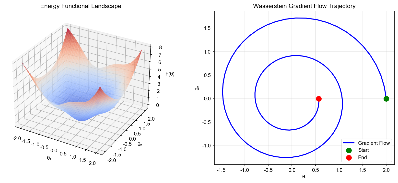 Wasserstein 几何为概率分布空间提供了自然的度量,梯度流理论将热方程、 Fokker-Planck 方程等经典 PDE 统一为能量泛函的梯度流。