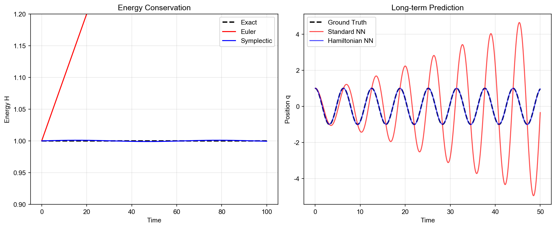传统神经网络在预测物理系统演化时,往往无法保持系统的内在结构——能量守恒、角动量守恒、辛结构等。一个简单的例子:用标准神经网络预测简谐振子的运动,即使训练误差很小,长时间演化后能量会逐渐漂移,轨迹偏离真实轨道。这是因为标准神经网络没有编码物理系统的几何结构。