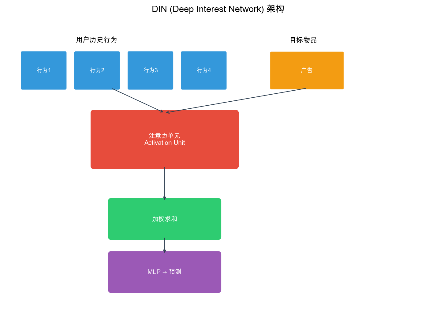 User Features → Embedding Layer Behavior Sequence → Embedding Layer → Local Activation Unit (Attention) Candidate Item → Embedding Layer Context Features → Embedding Layer ↓ Concatenate All Features ↓ MLP Layers ↓ Output (CTR)